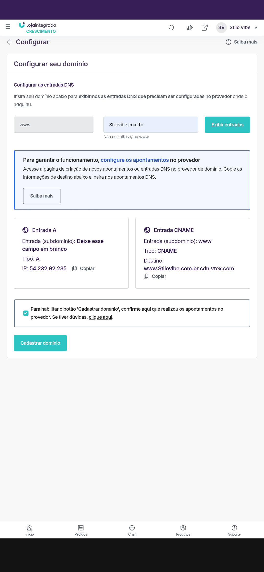 Ok, do lado da configuração de DNS está tudo certo. Agora precisa adicionar esse domínio no painel da Loja Integrada: